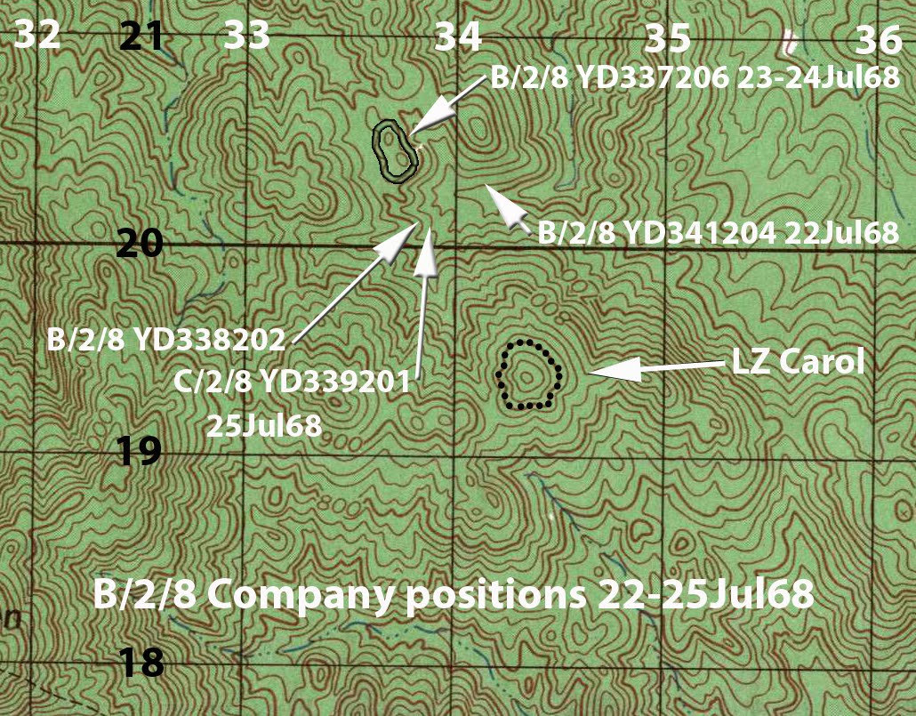 These Bravo Company firefights were the beginning of a long and vicious contest between US and NVA forces for control of the chain of mountains surrounding LZ Carol. The 1st Cavalry Division established LZ Carol on Hill 927 (YD343194) in July 1968, but it was abandoned at some later date, probably around the time when the division moved south in October 1968. LZ Carol was reoccupied in March 1970, this time by the 101st Airborne Division and they gave it a new name - Fire Support Base (FSB) Ripcord.