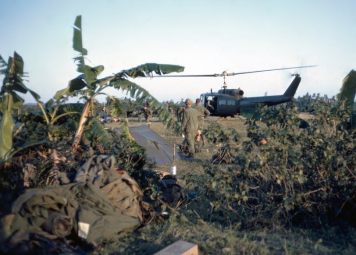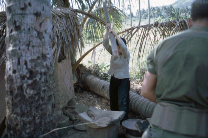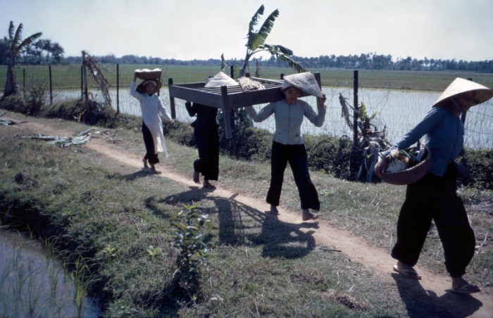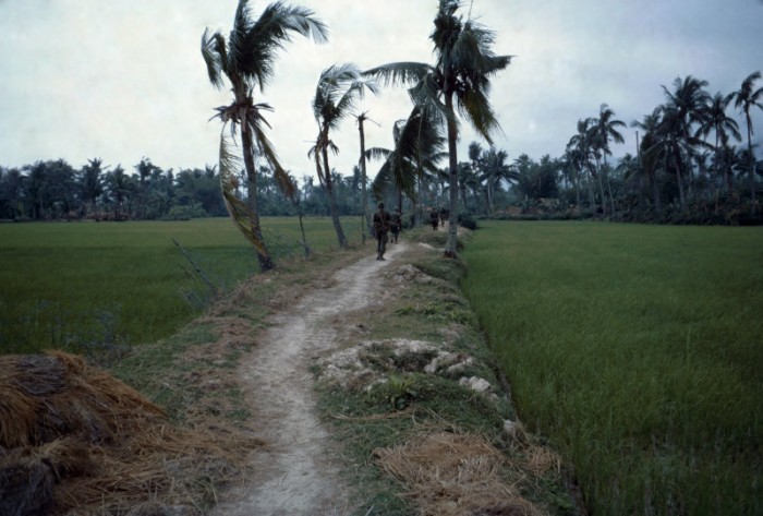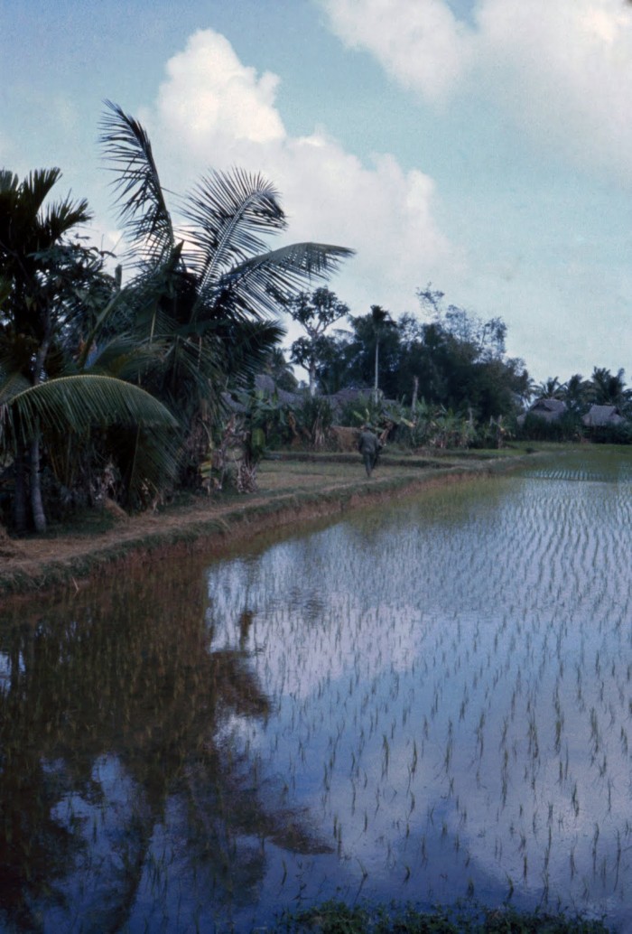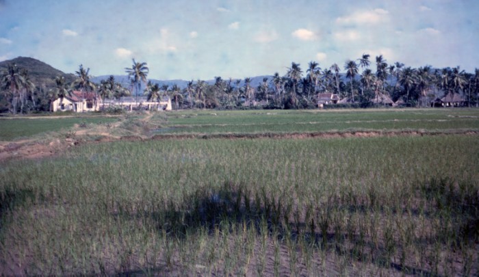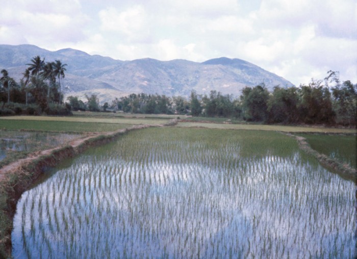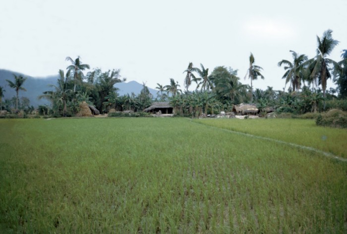 Bong Son was our base area and was also known as Cav Country. Here we were very familiar with the terrain, the tactics of various enemy units operating in the region and the way of life of the local inhabitants. Although we frequently deployed to distant areas to combat large-scale enemy units, our return to Bong Son was like coming home. Bong Son to us included the small market town of that name located close to LZ English, and the vast hinterland of rice paddies that stretched from the mountains to the South China Sea. The local economy was based on rice farming and scattered throughout the Bong Son plains were countless small hamlets where farming families lived. Bong Son is very picturesque and the beauty of the rural scenery and our fascination with the local inhabitants was captured in numerous photographs by members of Bravo Company. AERIAL VIEW OF BONG SON LOOKING EAST TOWARDS THE SOUTH CHINA SEA. Thanks to Chris Decker ![]() HAMLETS AND RICE PADDIES Thanks to Tom Beach ![]() RICE PADDIES SEPARATED BY DIKES Thanks to Tom De Young ![]() SMALL HAMLET Thanks to Tom Beach ![]() BRAVO PATROL MOVING ALONG RICE PADDY DIKE Thanks to Tom Beach Dikes were also the main paths connecting hamlets and were used for taking agricultural produce to the market at Bong Son. These dikes were dangerous because of open exposure with no cover to sweeping fire by the enemy from tree lines. Small mines and booby traps/punji traps were often emplaced by local guerrilla soldiers or as ambush sites along the dikes. ![]() TYPICAL HOUSE IN A HAMLET Thanks to Tom Beach ![]() WELL CARED FOR HOUSE WITH MANY POTTED PLANTS Thanks to Tom Beach ![]() PROSPEROUS RICE FARMERS HOUSE Thanks to Tom Beach ![]() NEWLY SEEDED RICE PADDY Thanks to