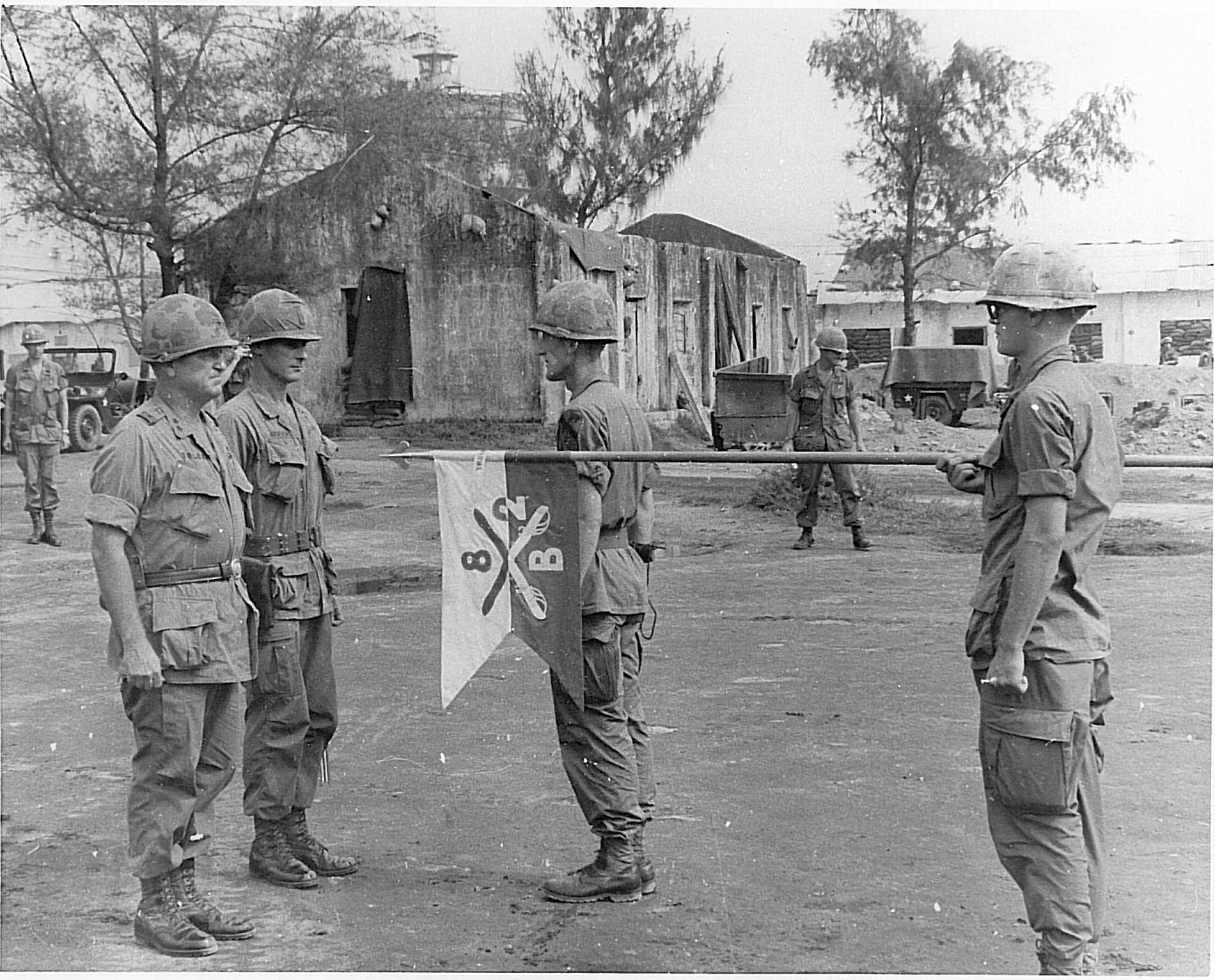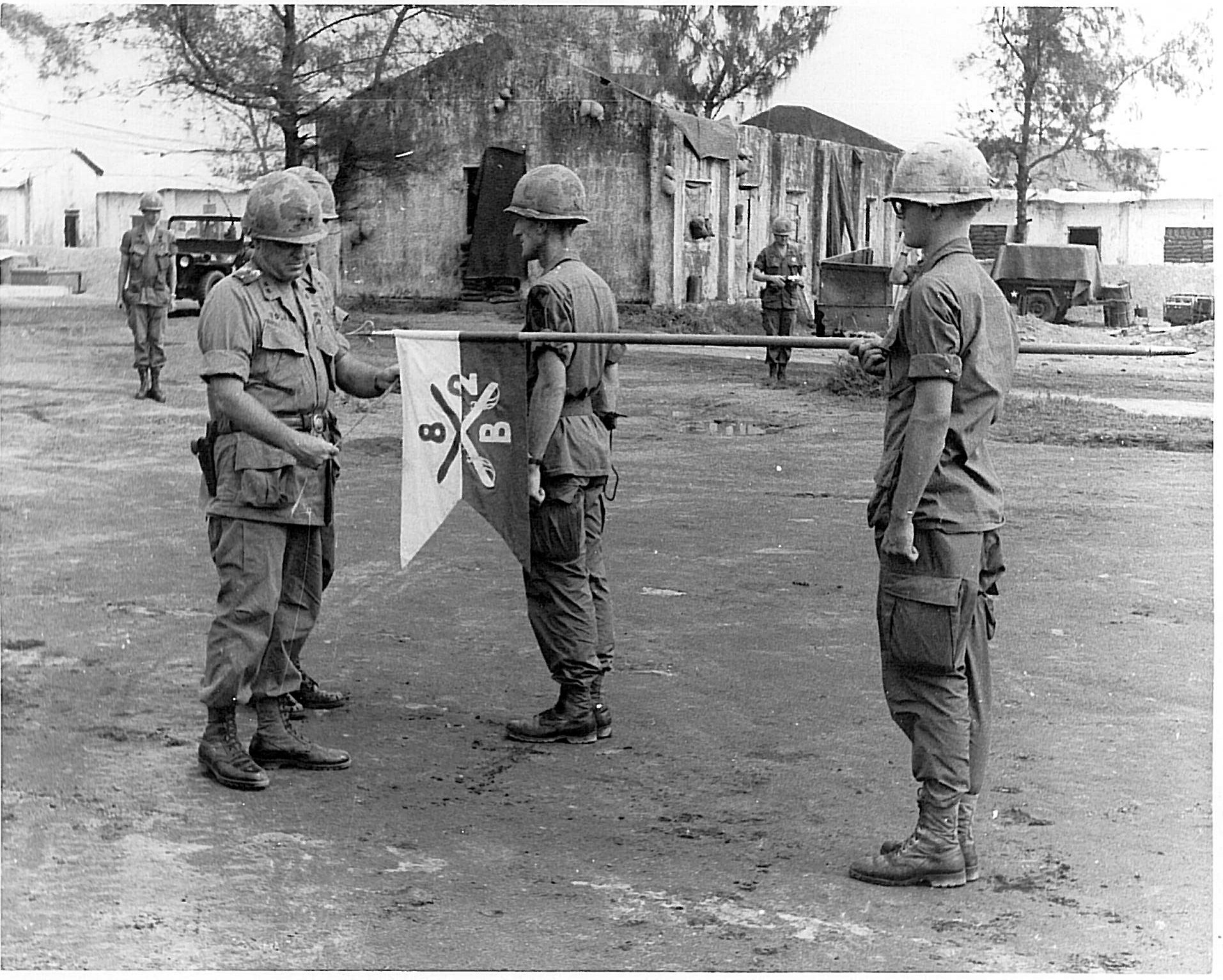 ![]() General Tolson and on his left, our Battalion Commander, LTC Howard Petty, who was killed on 15 March 1968. Receiving the award, Captain Peter O’Sullivan, Commanding Officer, Bravo Company. Guidon Bearer SGT Richard Miller. |