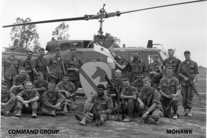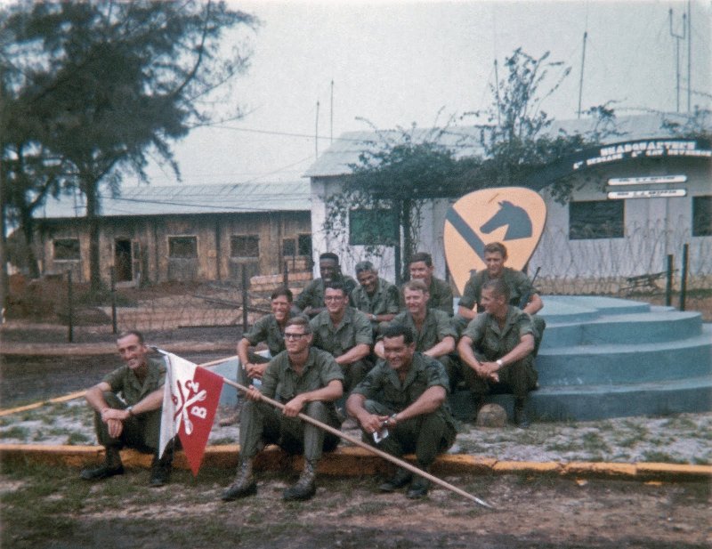 BRAVO COMPANY OFFICERS AND SENIOR NCOs, FEBRUARY 1968 ![]() Front row left to right: Captain Peter O'Sullivan, Sergeant Richard Miller (standard bearer) and First Sergeant Fernando B. Rodriguez. Row two left to right: Lieutenants Charles Ready, Jim Smith, Thomas Beach and Thomas DeYoung. Row three left to right: Sergeants Emanuel Bradford, Julio Navarro-Santana, James Harrison, and William Lewis. Thanks to Steven Gordon for this photograph. Probably taken immediately after the award of the valorous Unit Citation to Bravo Company by General Tolson. |